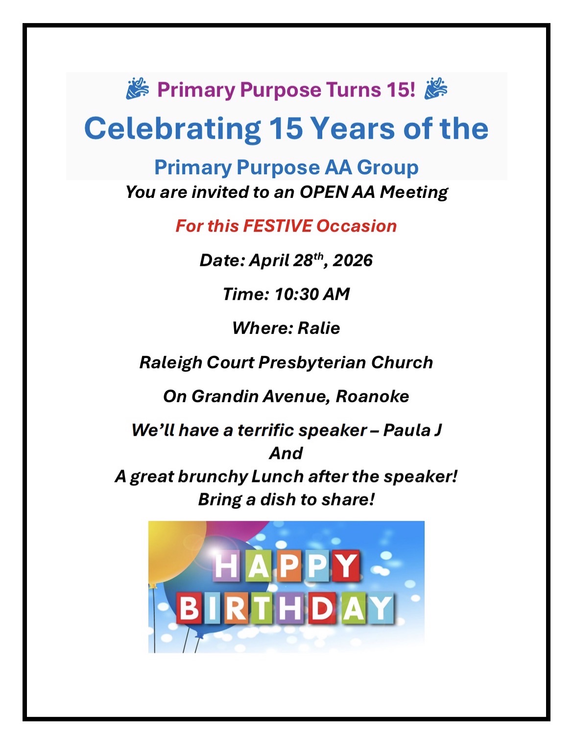 Primary Purpose is celebrating 15 years! This event will take place on Tuesday, April 28 at 10:30 am in Roanoke. See below for more details.